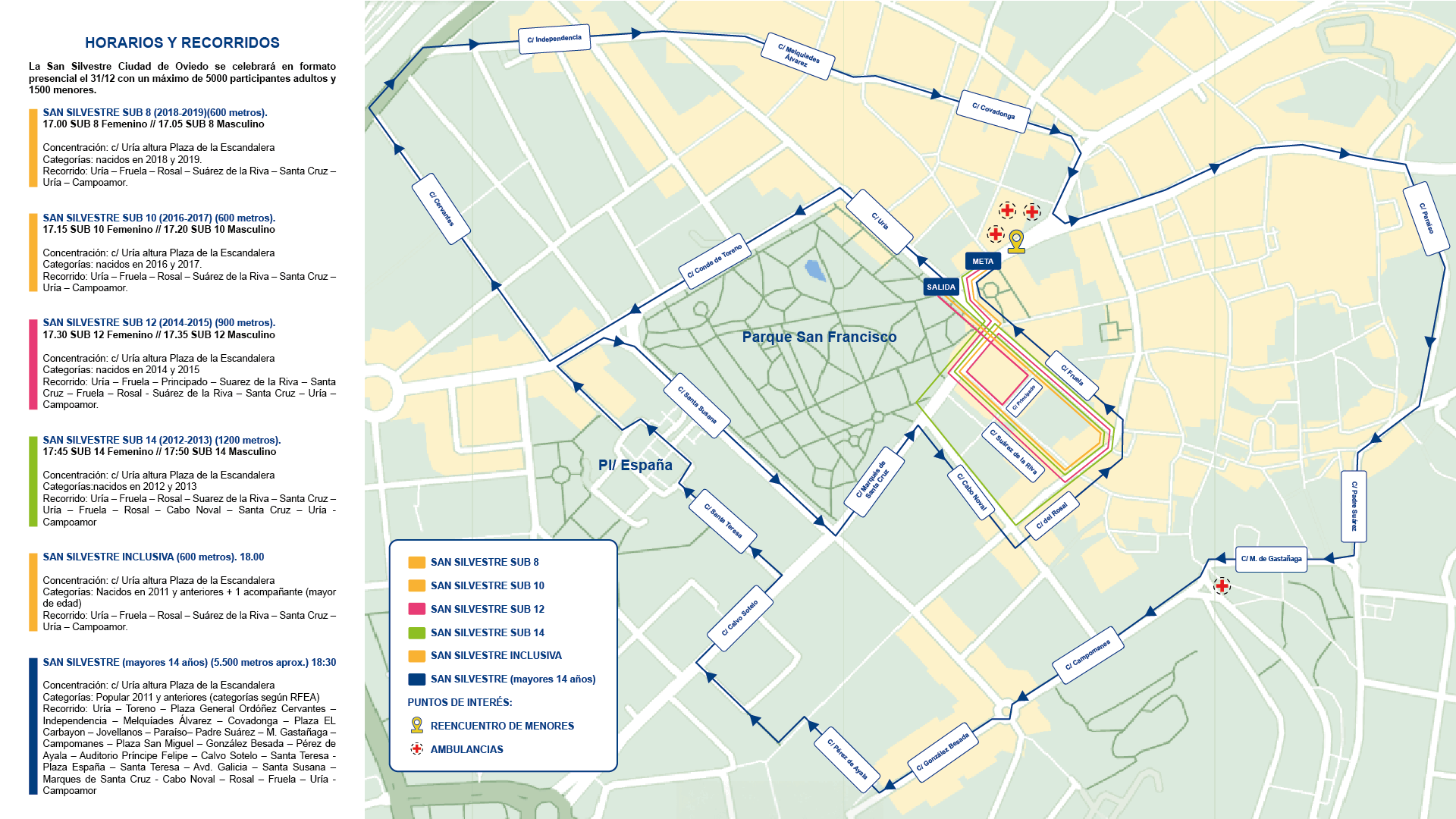 Recorrido: C/ Uría (Plaza la Escandalera) – Fruela – Principado – Suarez de la Riva – Santa Cruz – Fruela – Rosal – Suárez de la Riva – Santa Cruz – Uría – Campoamor